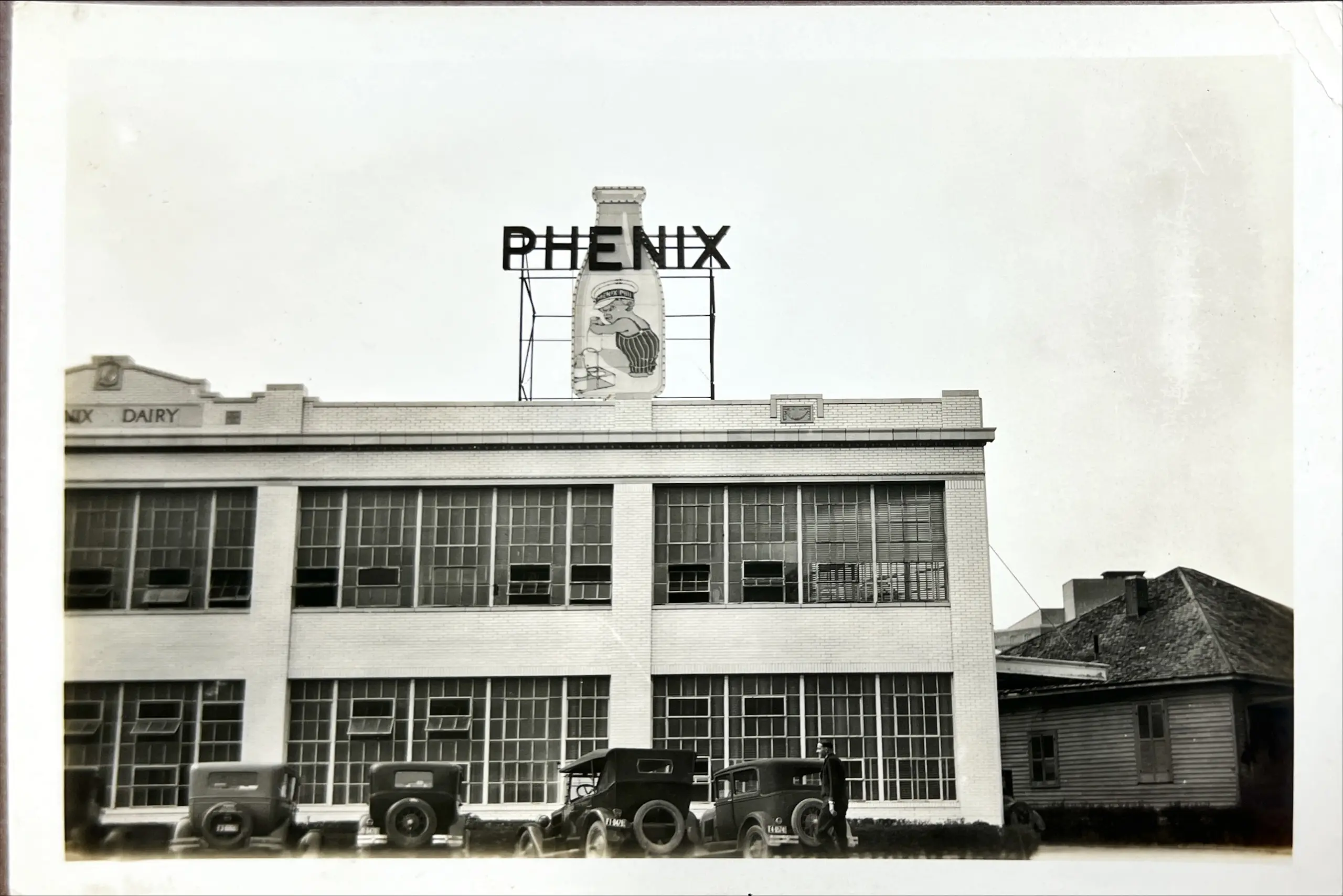 B&W photograph of early neon sign 1930-1940s with figure – “Phenix.”