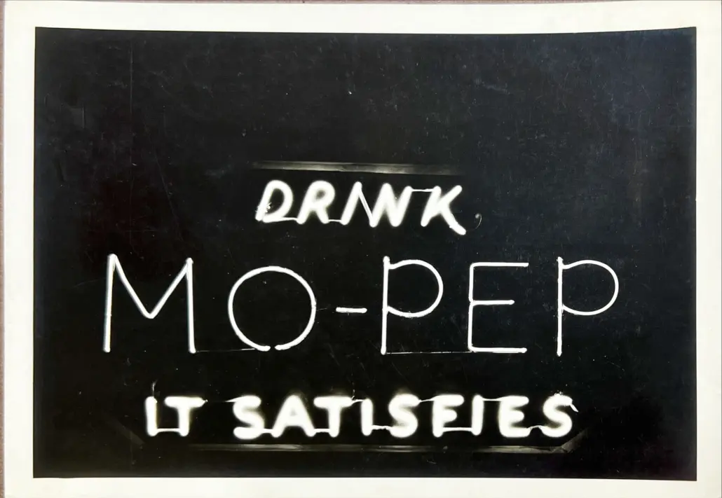 B&W photograph of early neon sign 1930-1940s – “Drink Mo-Pep It Satisfies.” Photo was taken at night.