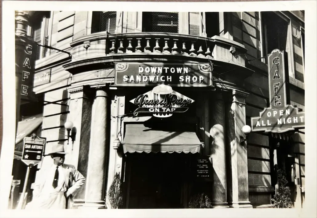 Photograph of early neon sign 1930-1940s with figure – Downtown Sandwich Shop – Grand Prize on Tap.