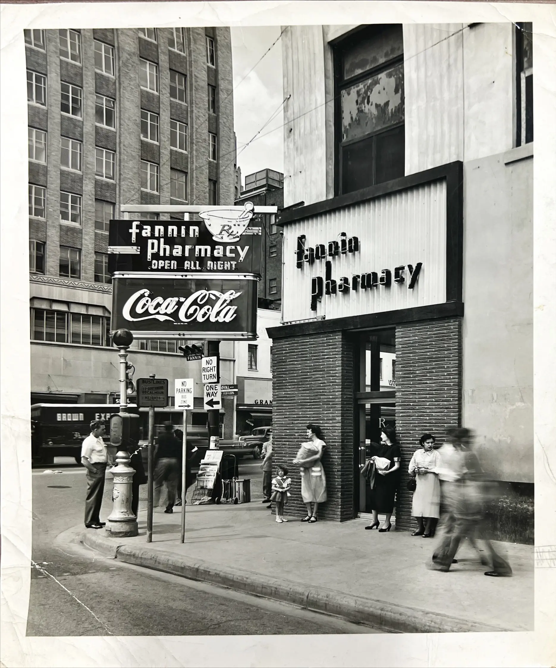 photograph of 1950s neon sign with figures on street corner – Fannin Pharmacy, Coca-Cola