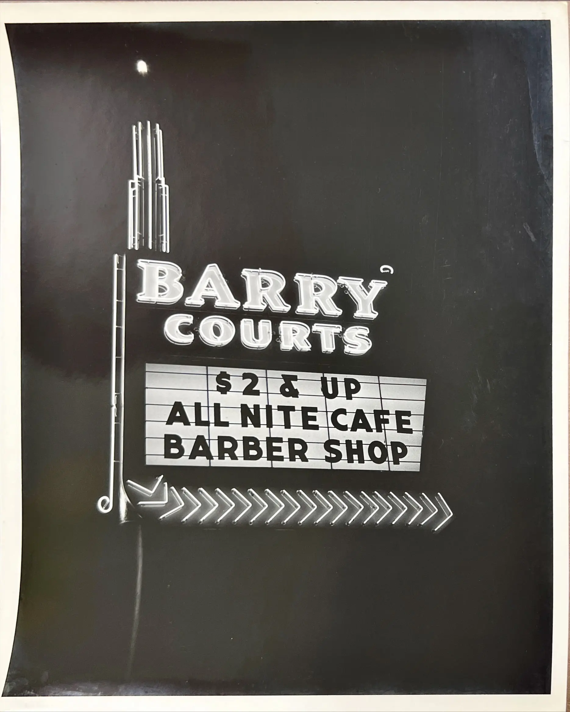 photograph of 1950s neon sign – Barry Courts “$2 & up all nite cafe barber shop”