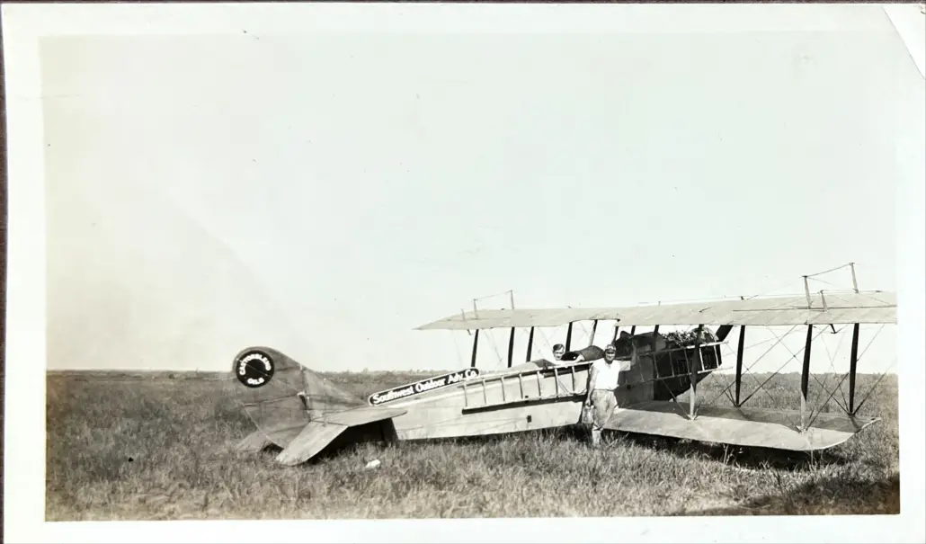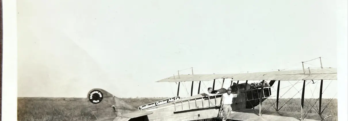 B&W photograph of airplane with figures – Southwest Outdoor Adv. Co.