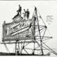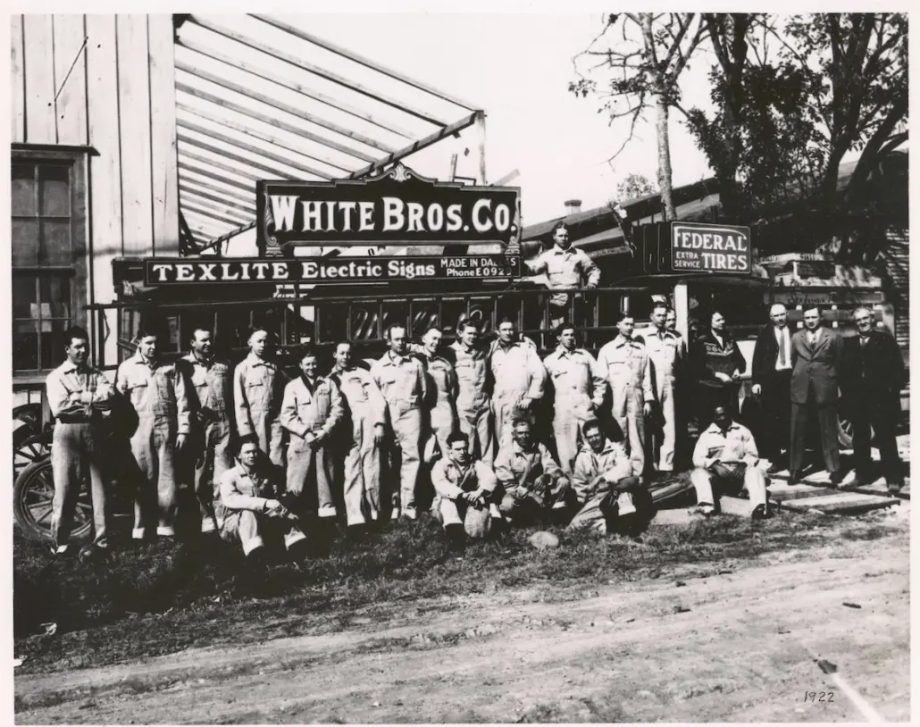 B&W photograph of signshop exterior with workers. White Bros. Co. – Texlite Electric Signs Tissue overlay identifies the people pictured.