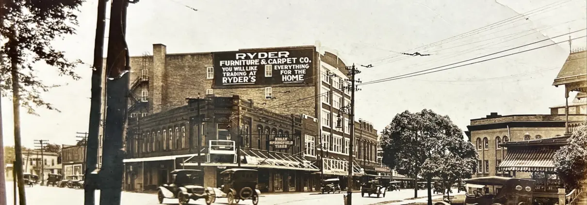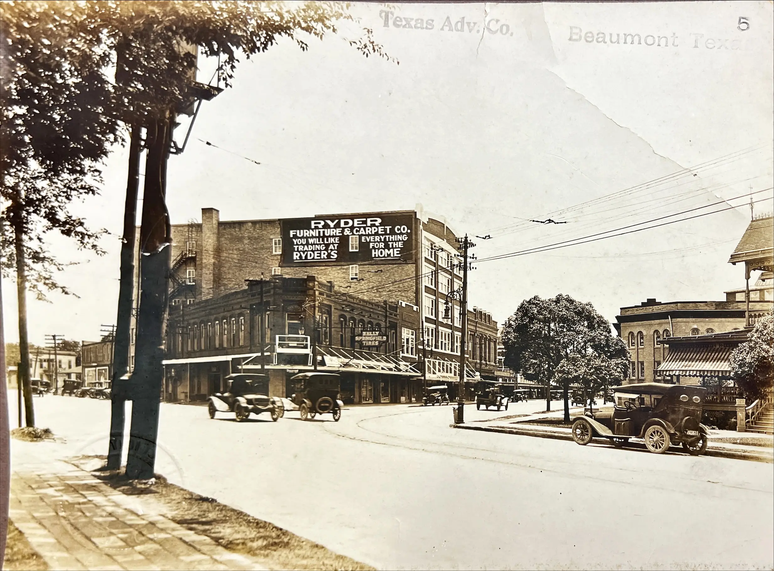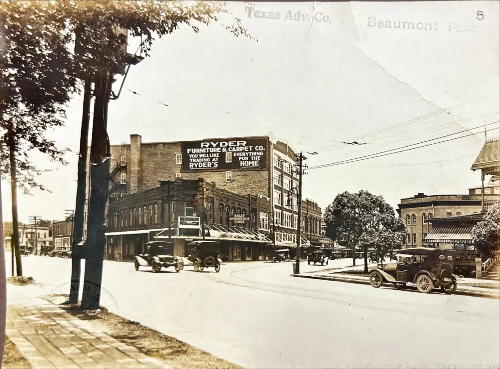 B&W photograph of early street scene – multiple signs – Texas Adv. Co., Beaumont TX “Pearl Street opposite Calder Avenue” Stamp reads Texas Advertising Company, Houston TX.