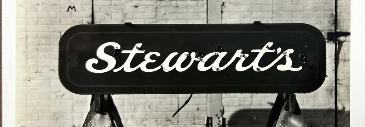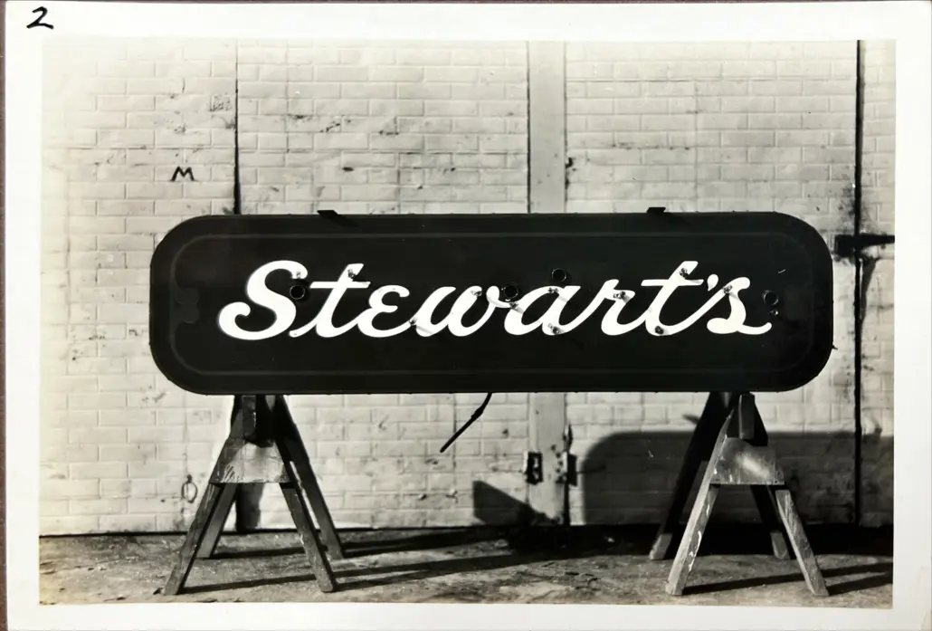 B&W photograph of early neon sign 1930-1940s – Stewart’s. Reverse reads “size of can: 2’x7′ Double Face, Stewart’s – 6″ script neon letters.”
