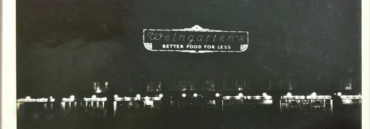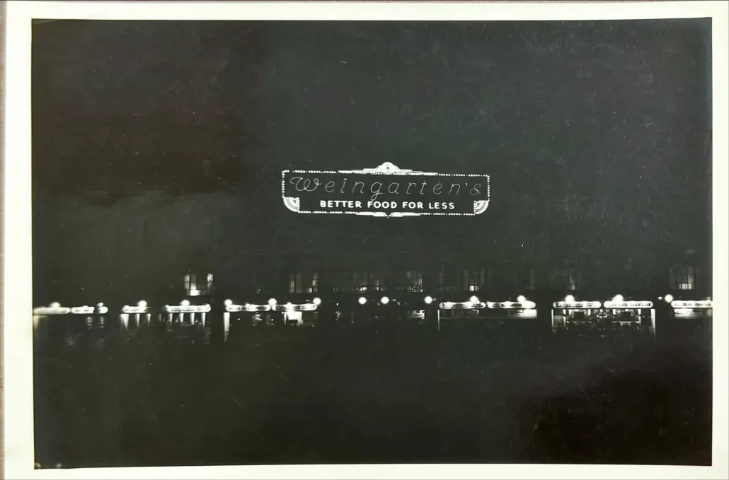 B&W photograph of early neon sign 1930-1940s – Weingarten’s. Photo was taken at night.