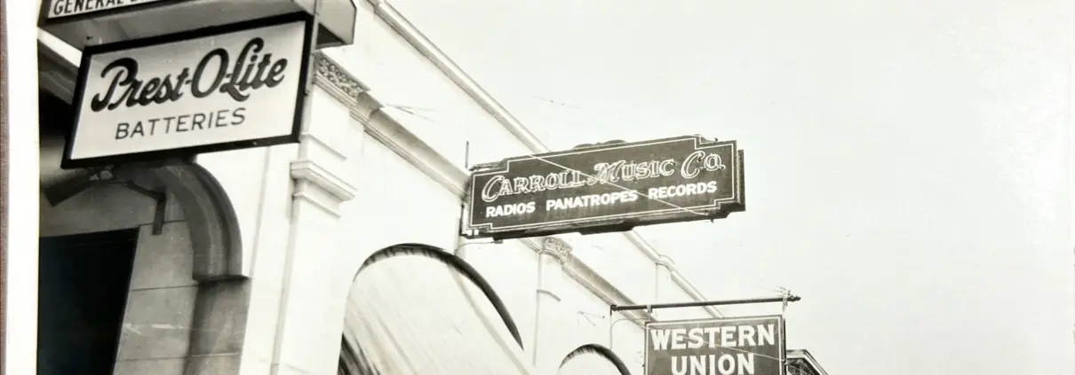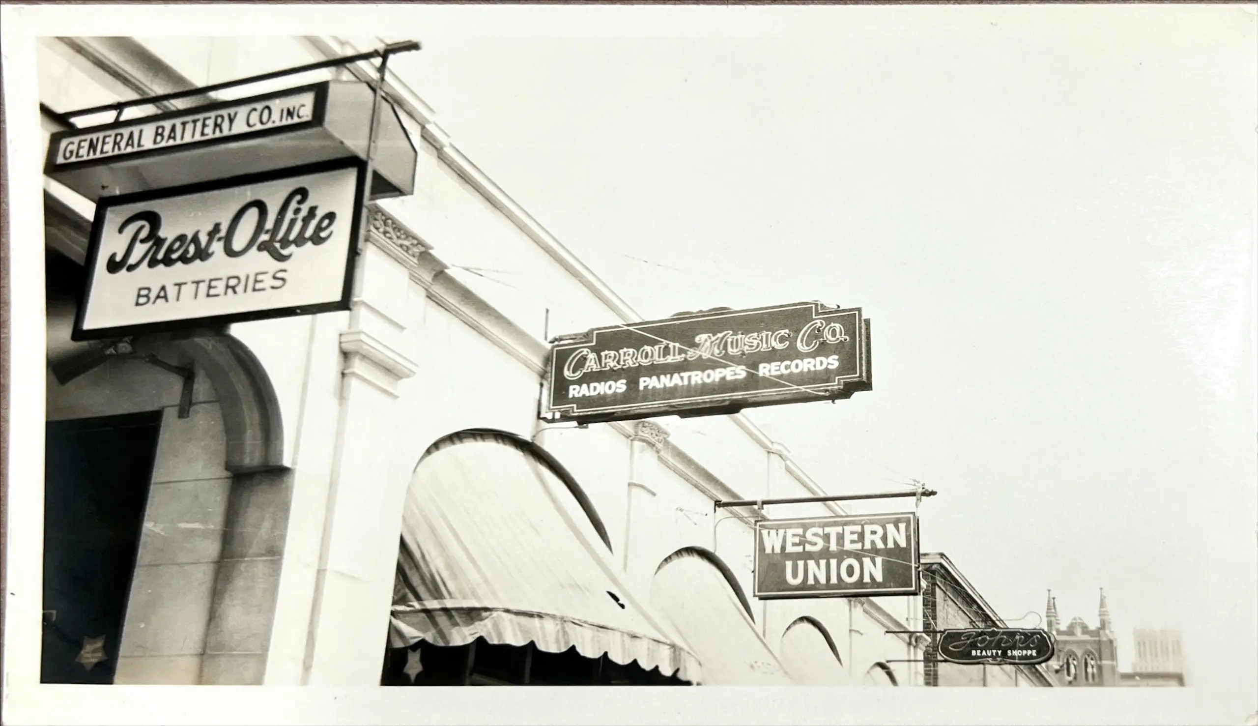 Photograph of early neon sign 1930-1940s – multiple signs: General Battery Co., Carroll Music Co., Western Union.