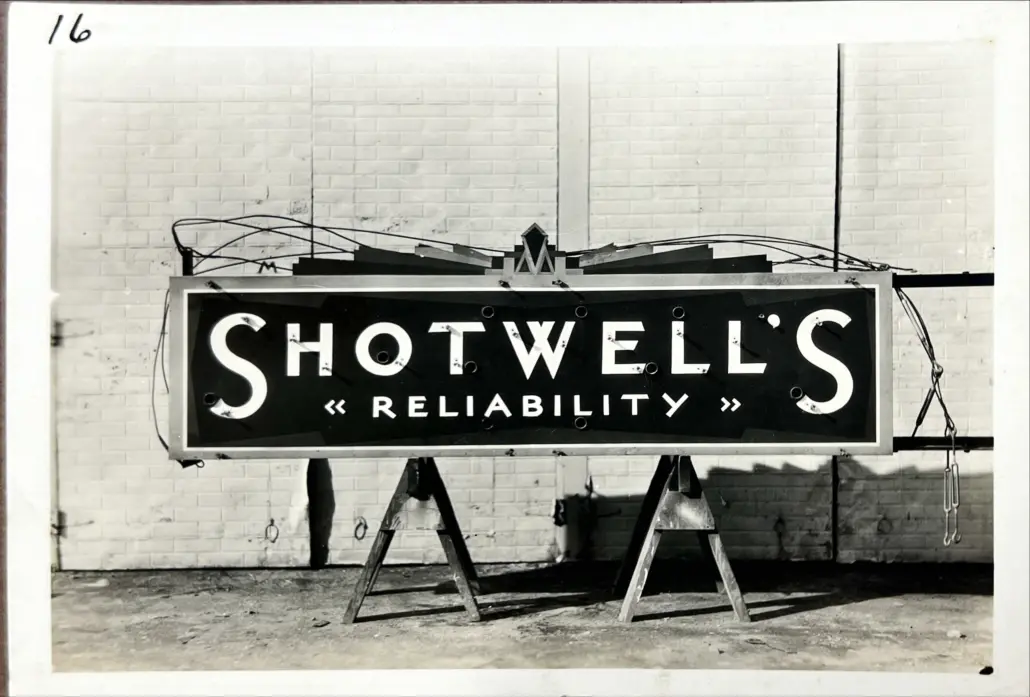 B&W photograph of early neon sign 1930-1940s – Shotwell’s Reliability. Reverse reads: “Size of can: 29″x9′ Double face, Shotwell’s – 8″ neon (16″S), Reliability – 3 ” paint, neon border.”