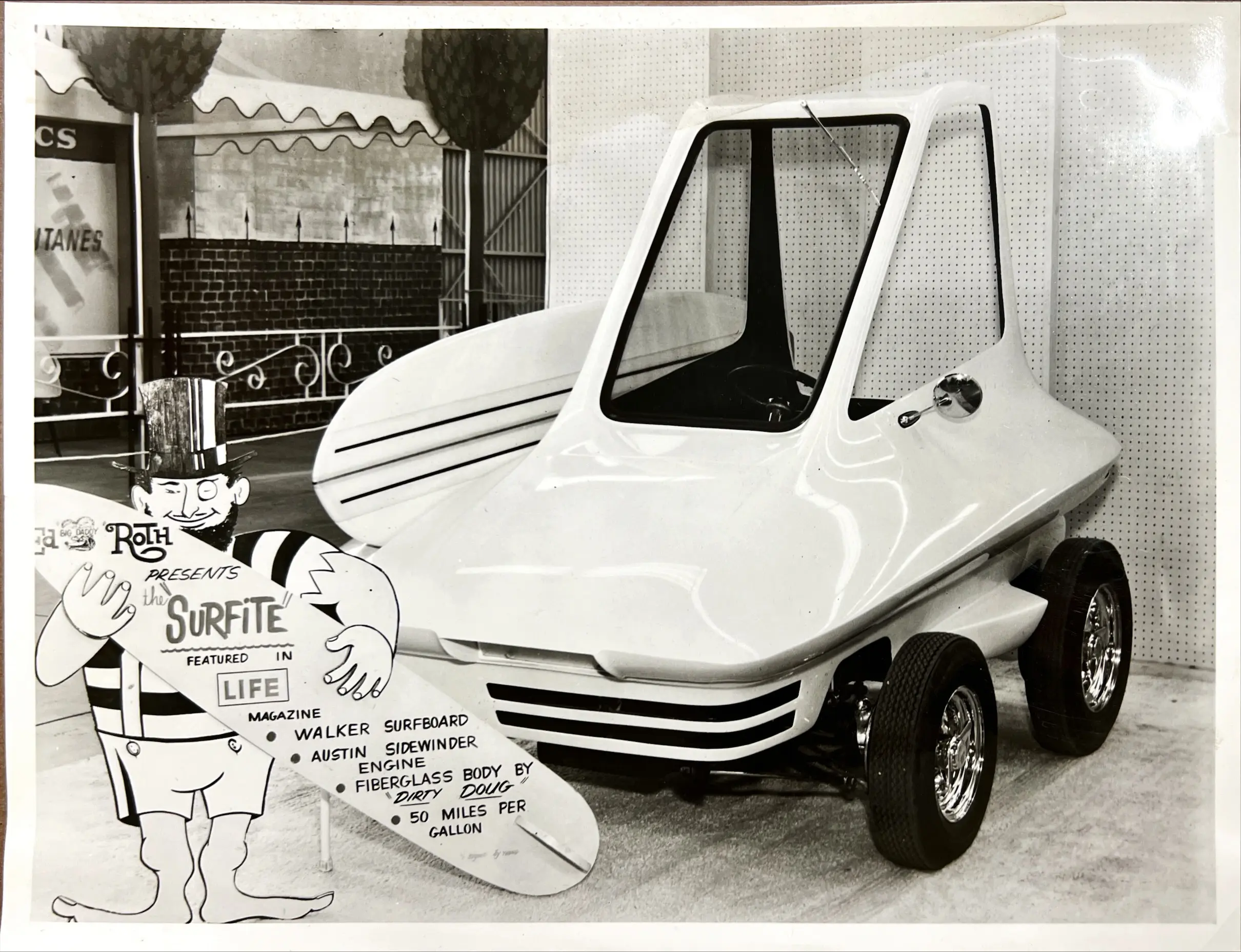 sign in photo reads “Ed ‘Big Daddy’ Roth presents the ‘Surfite’ featured in Life Magazine”