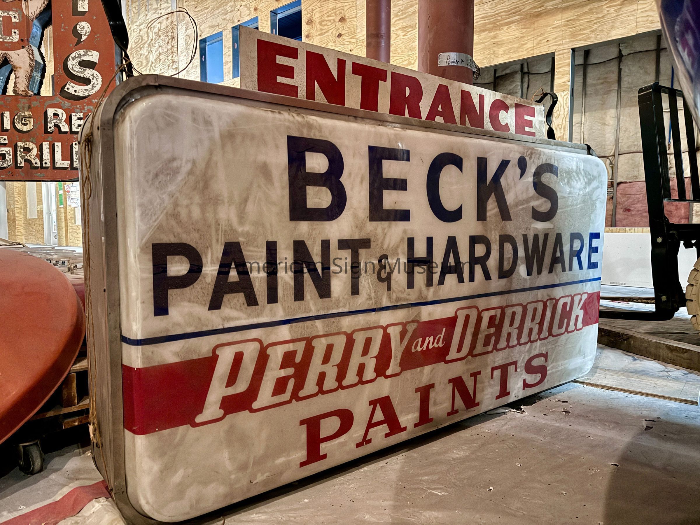 An internally-illuminated, double-faced plastic sign also made with aluminum and tin. It reads, "Beck's Paint & Hardware," and, "Perry & Derrick Paints." At the top, a privilege panel type section reads, "Entrance." The sign face's background color is mostly white with horizontal blue and red striping. Most of the text is red and black.