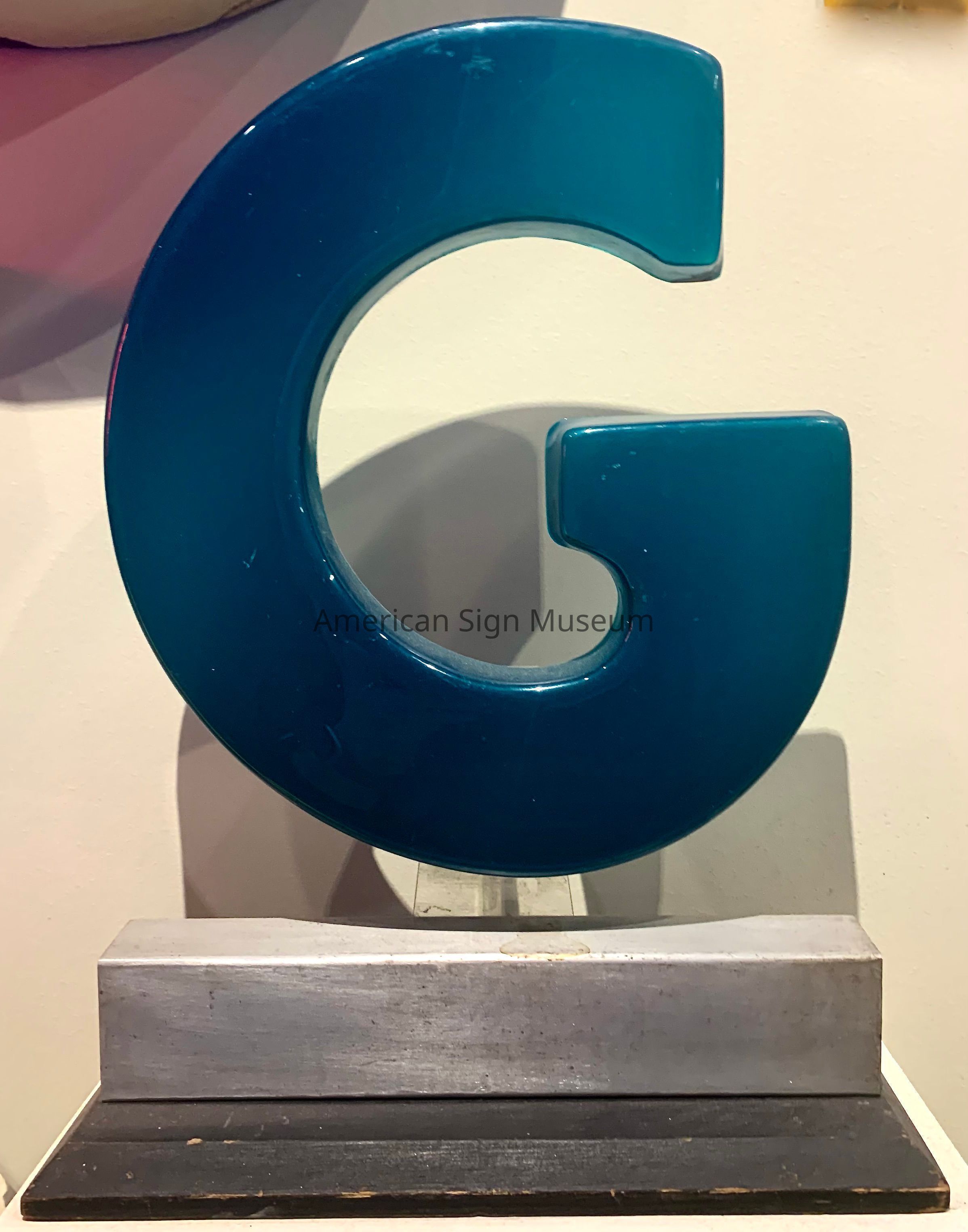 Saleman's sample comprises formed and plastic-backed plastic "G" mounted on plastic frame with wood base.