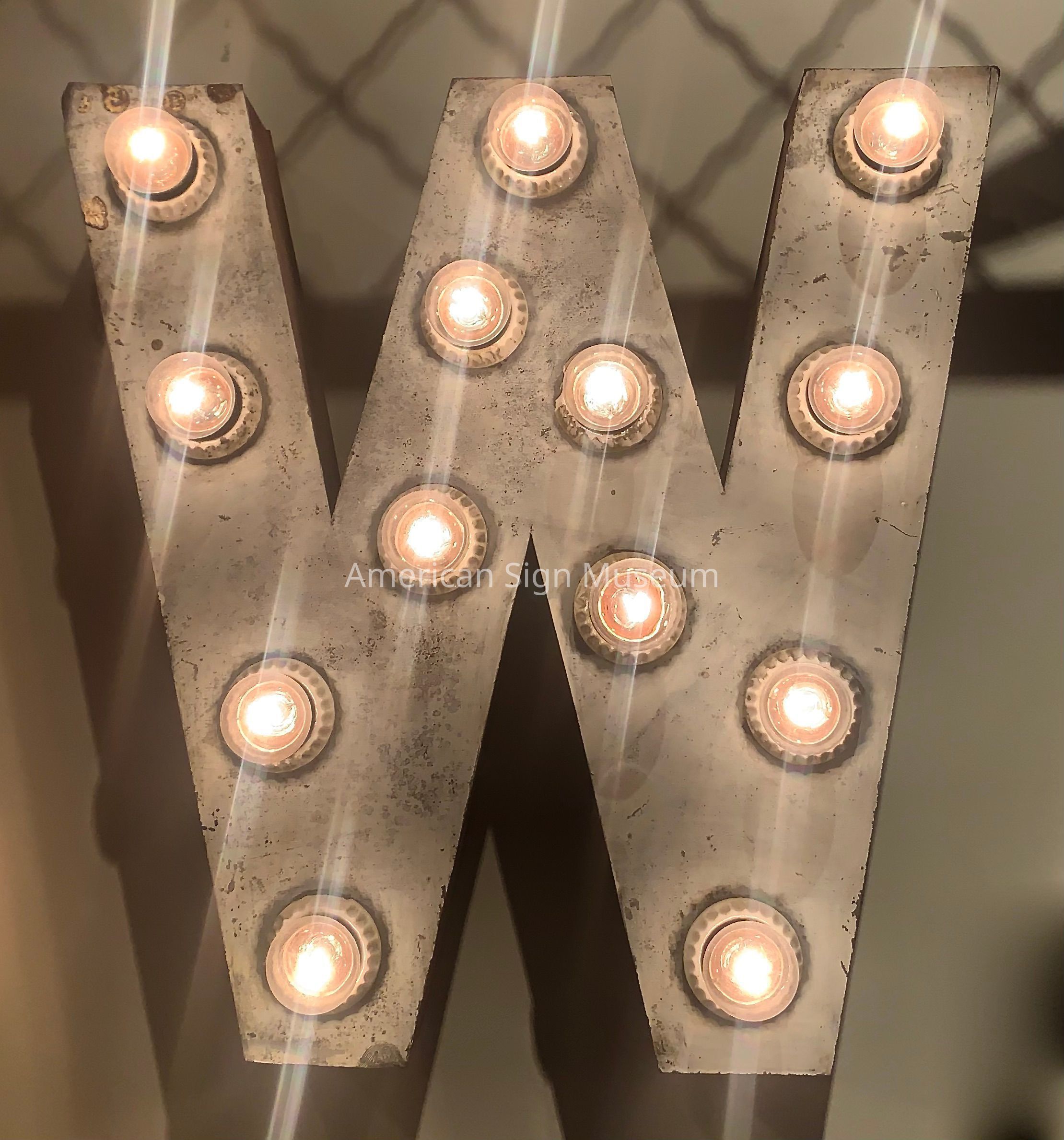 Metal theatre "W" letter is plug-in and houses incandescent bulbs. Clips on back indicate changeable installation.