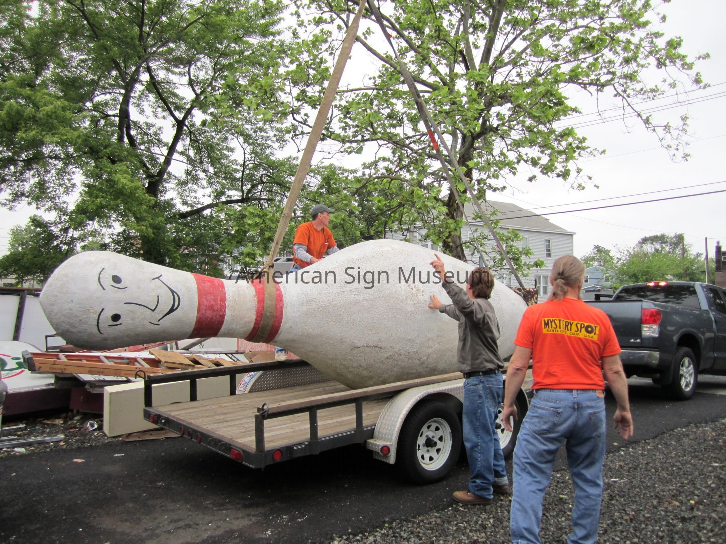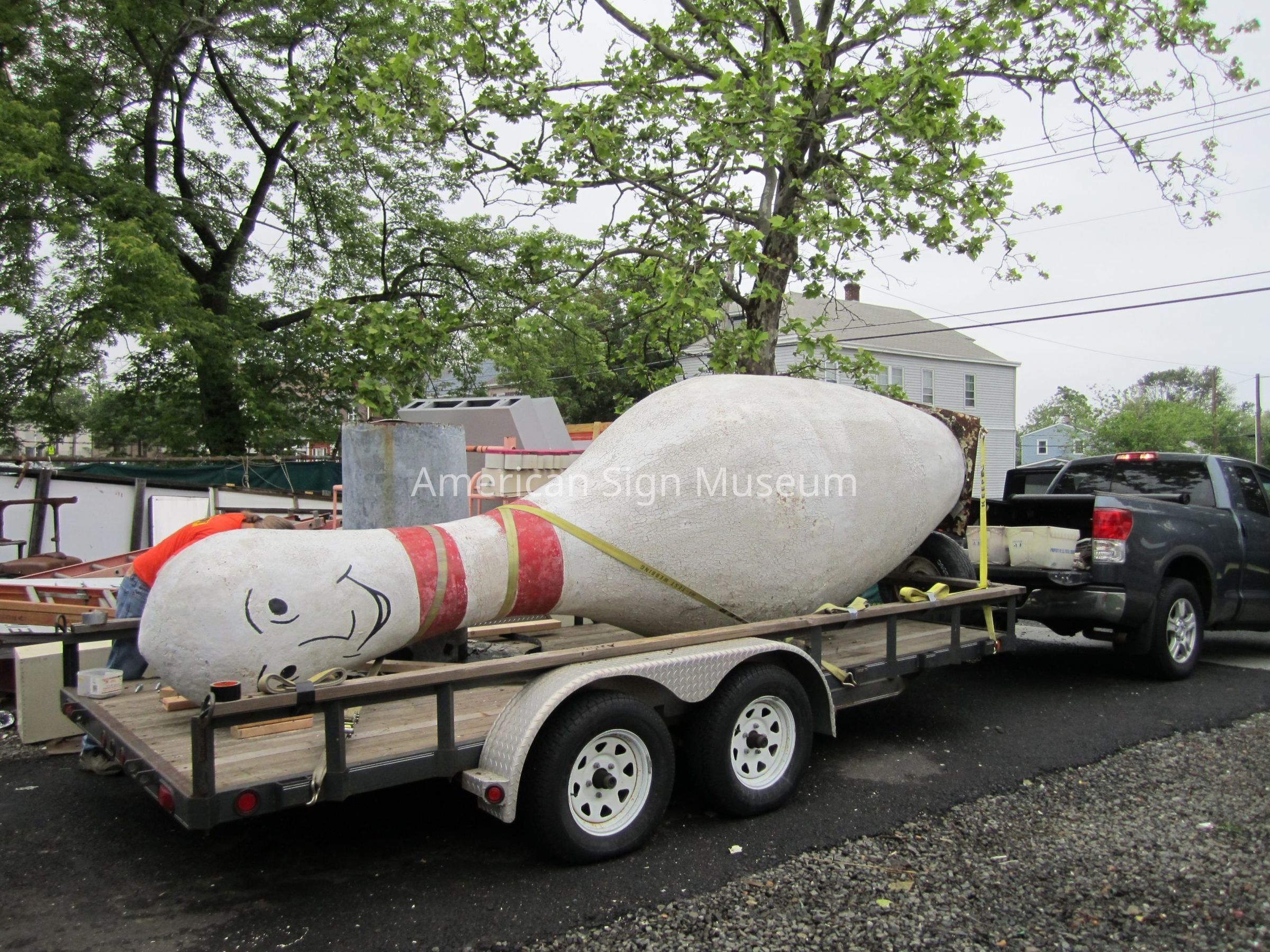 Bowling pin originally identified Greenbrook Bowling Lanes in Greenbrook, NJ. Ace Sign was asked to move the bowling pin to another bowling alley in Manville, NJ when the Greenbrook owner sold the bowling lane. Ace suggested that they actually install the bowling pin, but in order to save money, the owner had Ace simply place the pin on the roof. A couple days later, Ace got a call from the owner, telling them the pin had rolled off the roof and into the street and could they remove it and temporarily keep it at their shop. Ace did retrieve the bowling pin but despite repeated phone calls about what to do with the bowling pin, the owner never responded. The pin sat in Ace's yard for 15 years until they donated it to the museum in 2011. The bowling pin originally had a top hat on top of its "head," but it had deteriorated considerably and could not be saved.