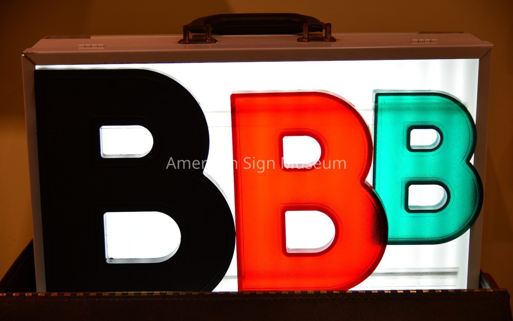 Salesman's sample comprises formed plastic letter "B" for Bevelite is mounted on reader board section.
