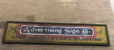 Painted tin sign inside of a wooden frame. The sign reads, "Advertising Sign Co." inside of a central blue box that is outlined with white paint. Below this, reads "Signs for Every Purpose" in dark lettering and white bordering. On the upper left and upper right areas of the sign, two hands are painted with an index finger pointed towards the text.