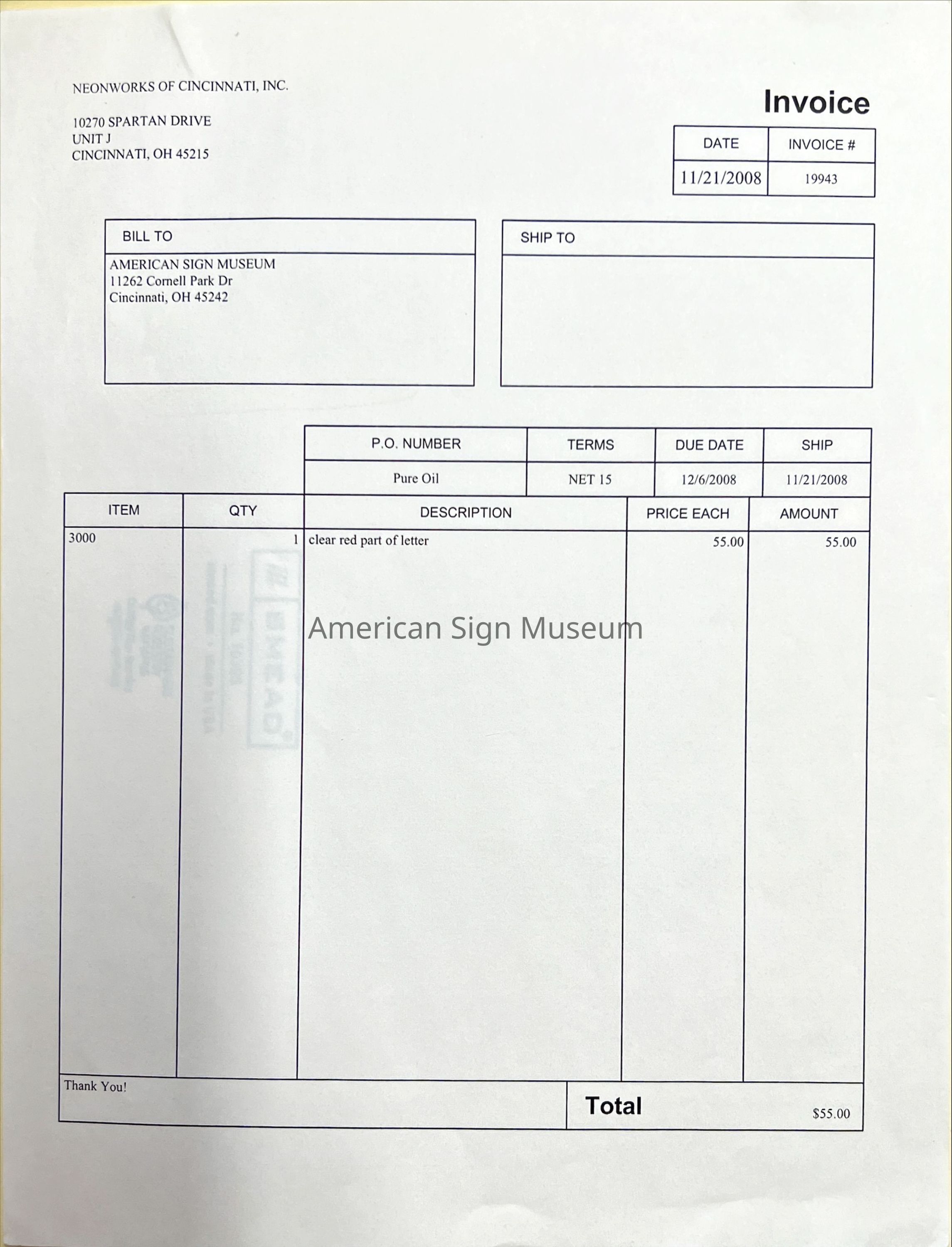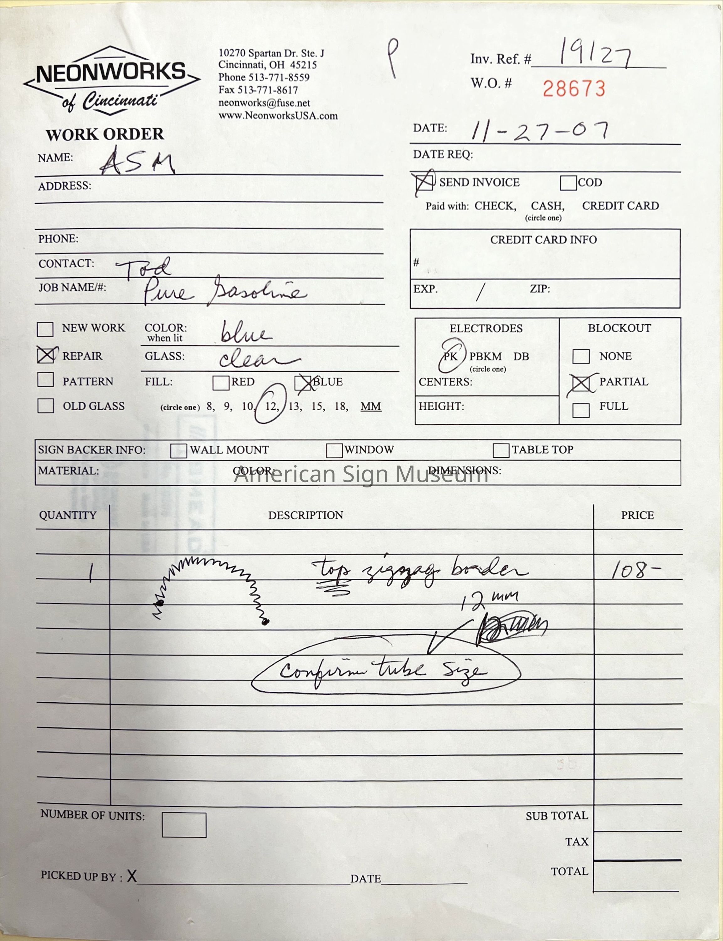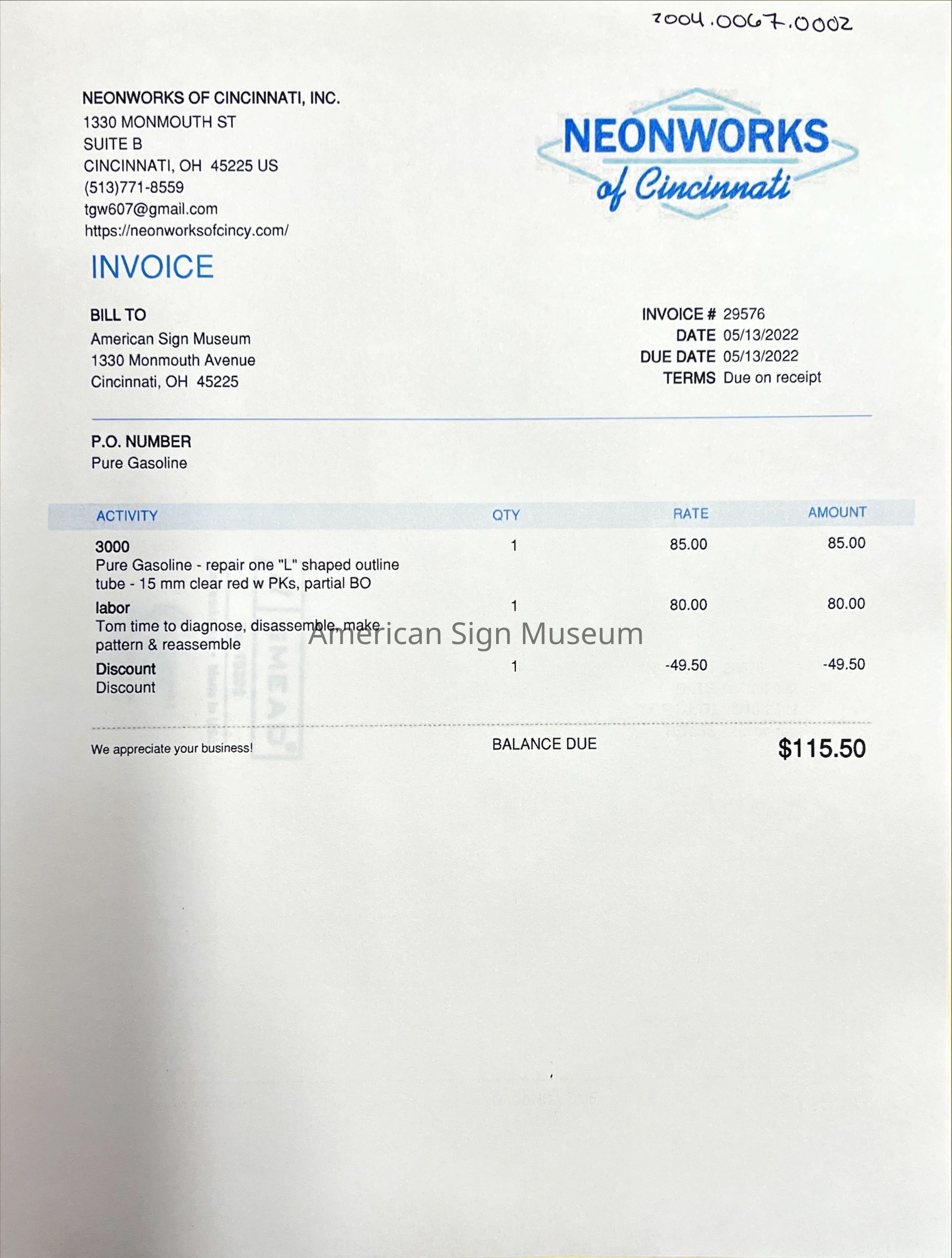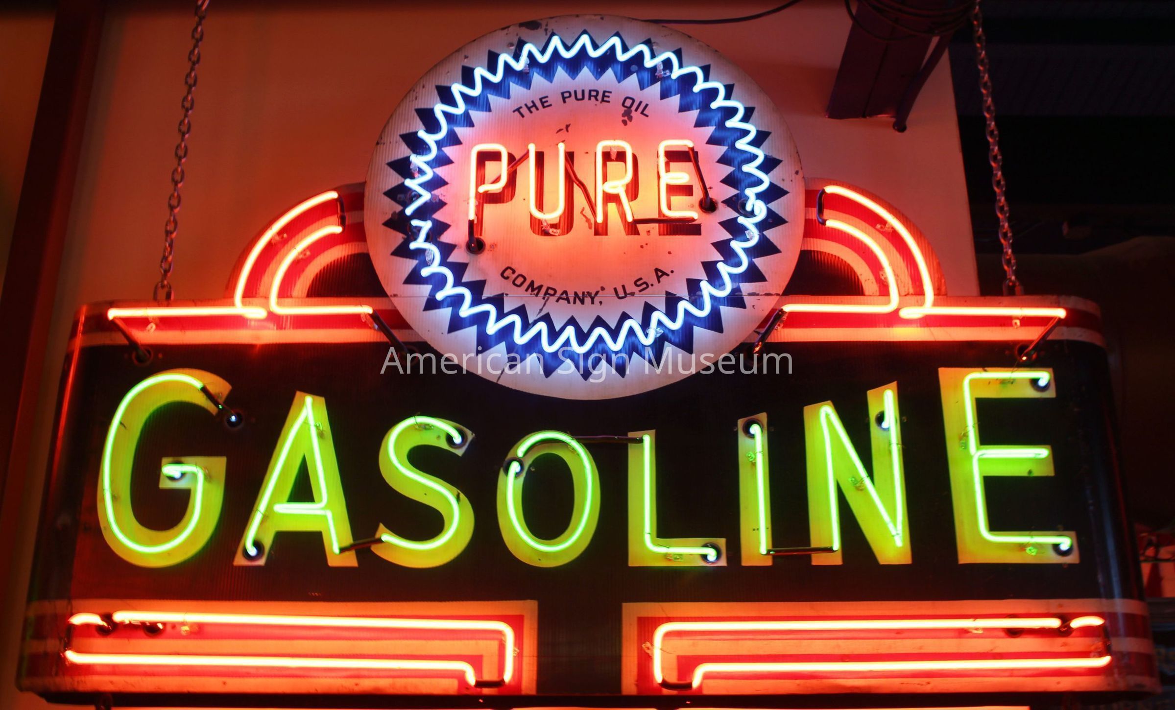 The early 1930s art deco neon sign features a ripple tin cabinet and an intricate neon ribbon logo border. Sign was manufactured by Flexlume Sign Corp., Buffalo, NY, and is one of only three known to exist. Its no. 3 glass housings were patented by Flexlume and its metal sign face was hand-painted. The rippled tin, an "embossed" look is completed with bullnose ends on either side. Neon was restored after acquiring the sign in 2004, including the Italian imported “Gasoline” tubing which simulates what would have originally been noviol gold glass.