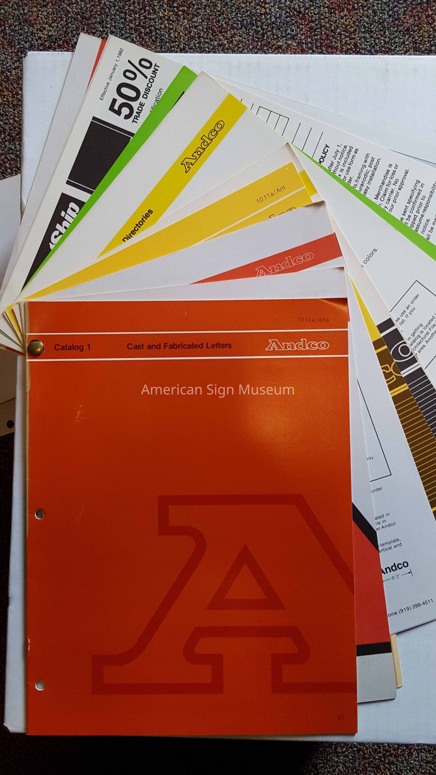 Collection of catalogs from Andco and pricing including: Cast and Fabricated Letters; Cast Plaques; Building Directories; Post/Panel Signage Systems; Exterior Color Card for Finishes. Printed in color.