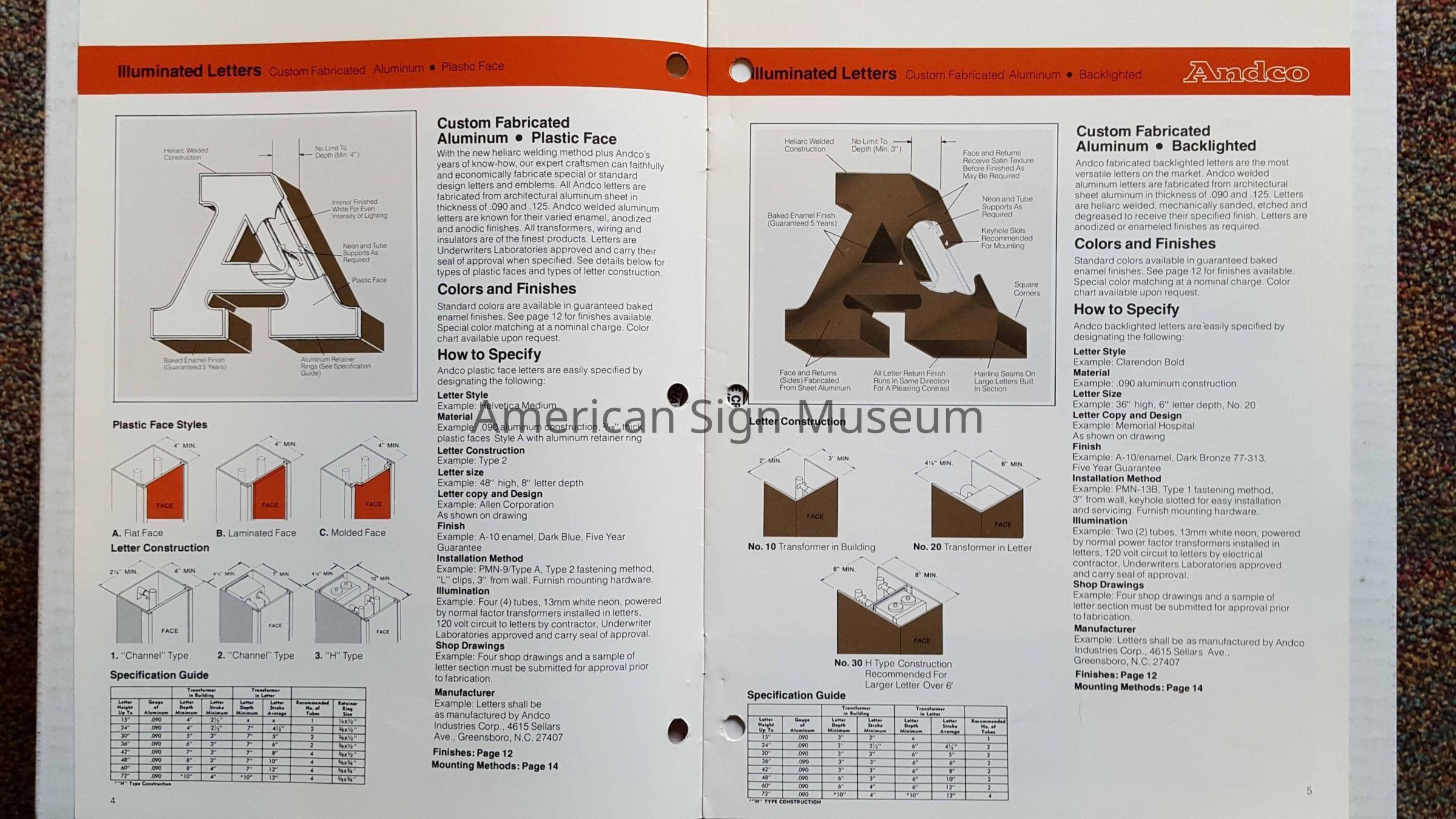 Catalog of illuminated letters, non-illuminated letters, cast letters, finishes, and mounting methods. Printed in color.