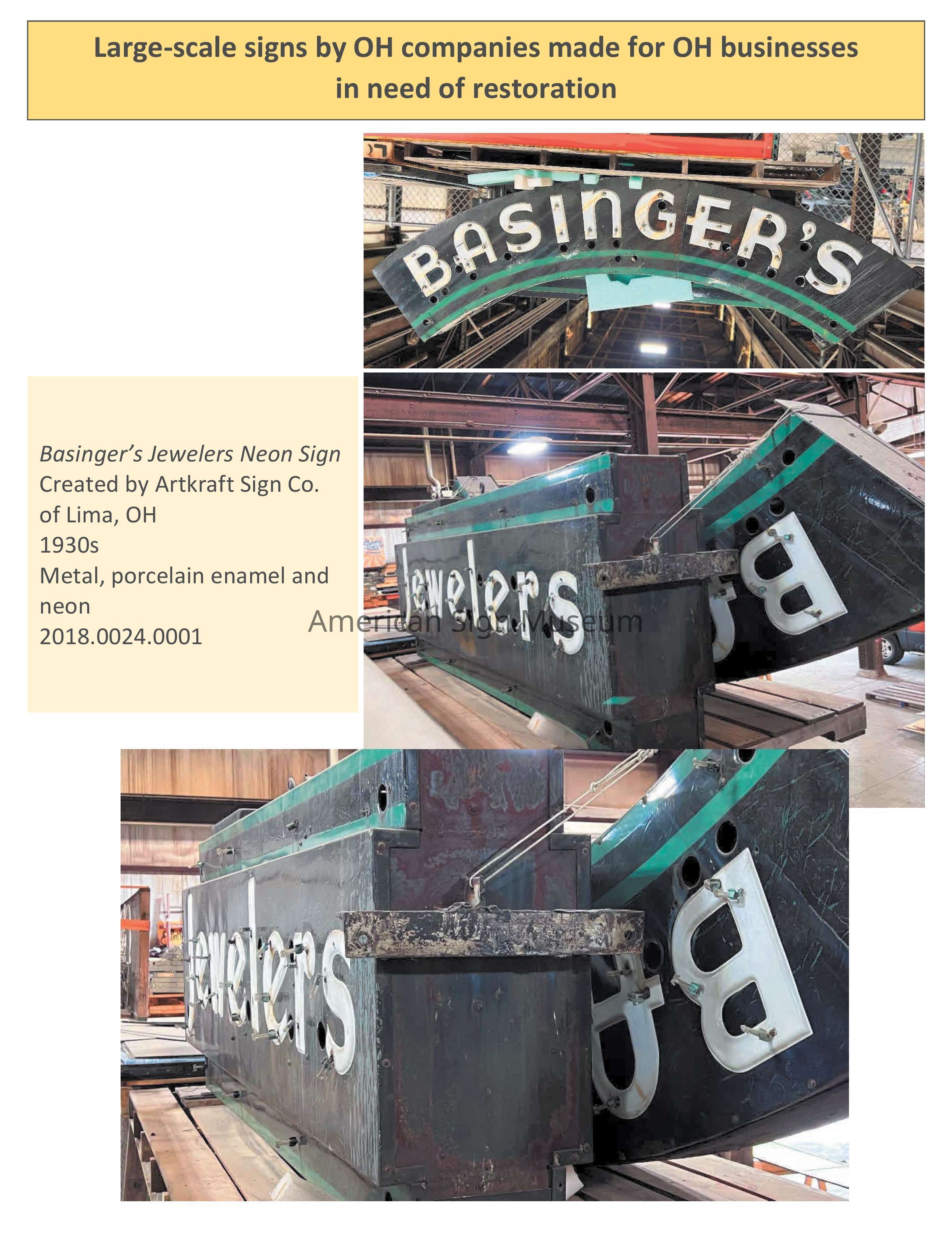ASM’s 1930s Basinger Jewelers sign is comprised of two halves of metal, porcelain enamel and neon lettering. It was manufactured by Artkraft Sign company, also founded in Lima, by leading sign-maker dubbed "the lamplighter of Broadway", Jacob Starr when he left his NYC employer, Strauss Signs, in the 1920s. After a successful first few years, Starr eventually merged his new Artkraft company with his former employer Strauss in 1931, creating the Artkraft Strauss Sign Company. The Lima location remained although the business was headquartered in NYC. By the 1950s, Artkraft Strauss was a goliath outdoor advertiser, responsible for the “smoking” Camel cigarette ads and the flying Anheuser-Busch eagle. Additionally, the company initiated the Times Square New Year’s Eve ball-drop tradition in 1907. Today, the company still maintains billboards, and provides advertising consulting for architects, designers, historians and outdoor advertising companies.