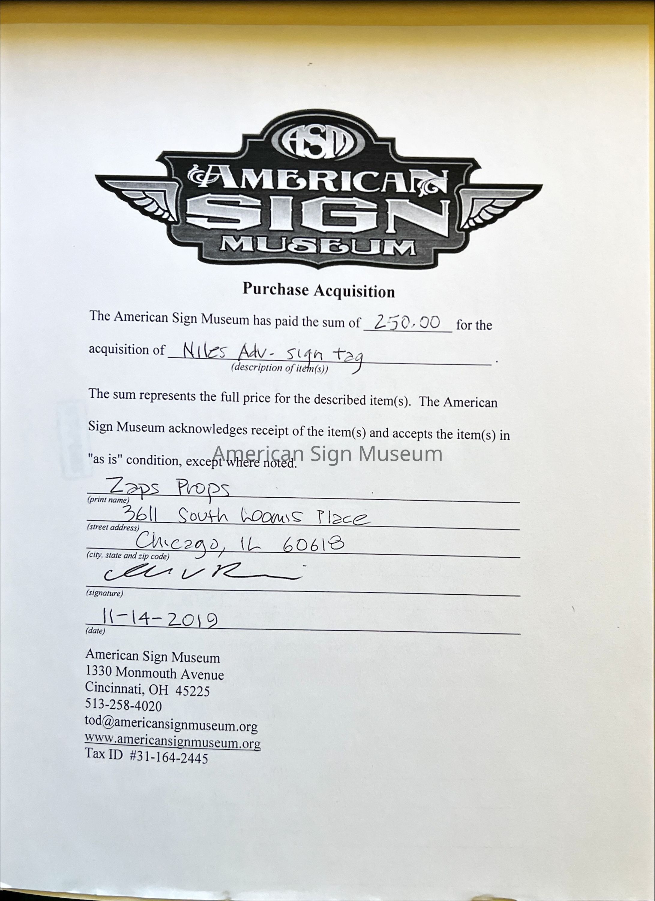 A sign tag from Niles Advertising Co.