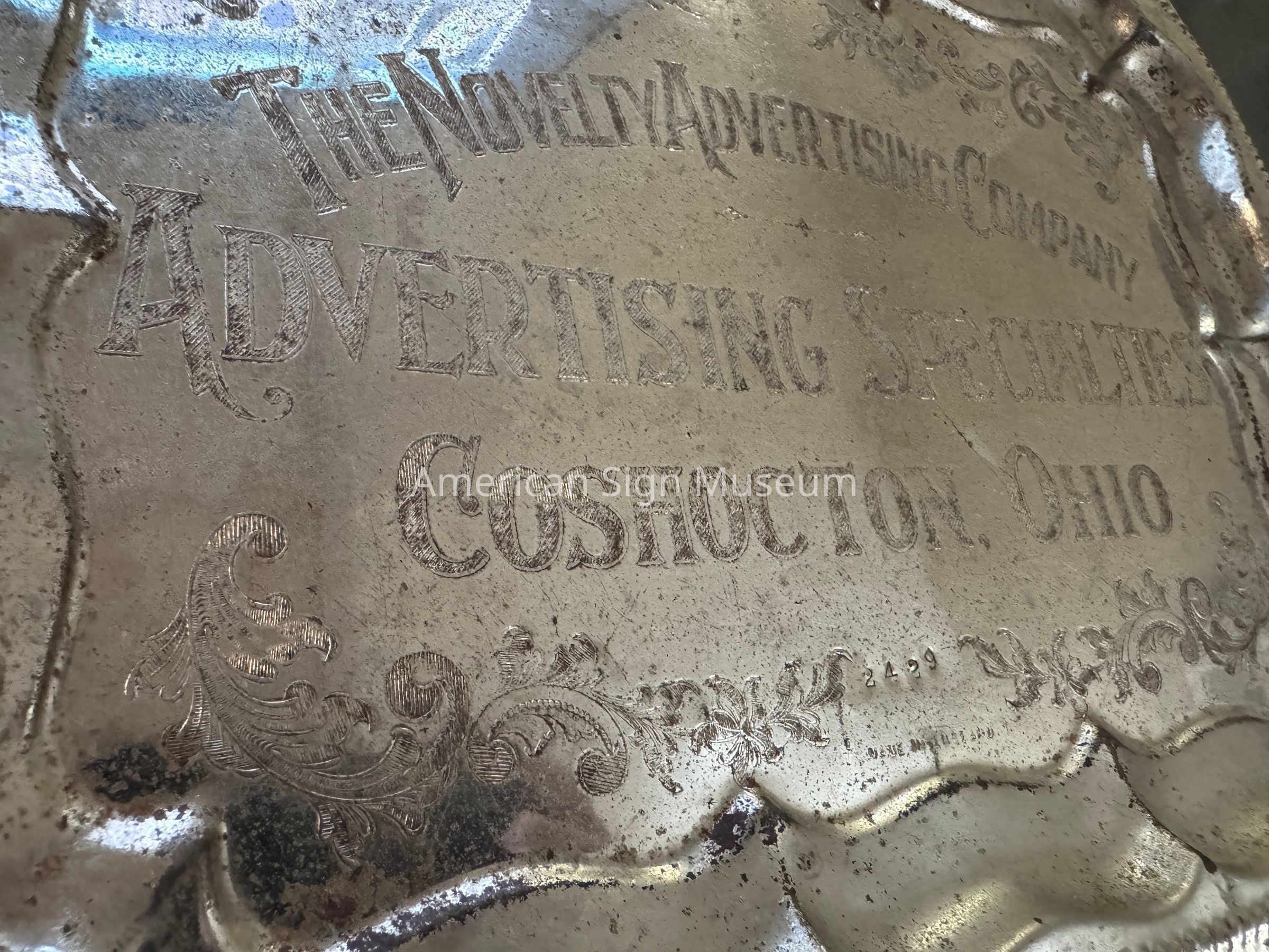 A silver plate tray that reads in etched lettering, "The Novelty Advertising Company," "Advertising Specialties," "Coshocton, Ohio". Ornate etched decoration also borders the plate's four corners.