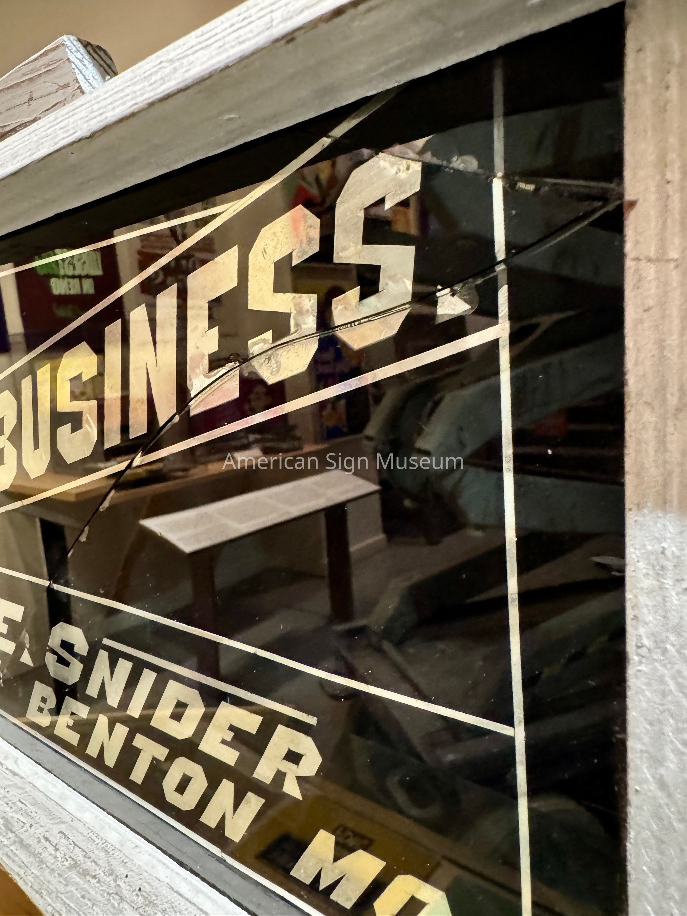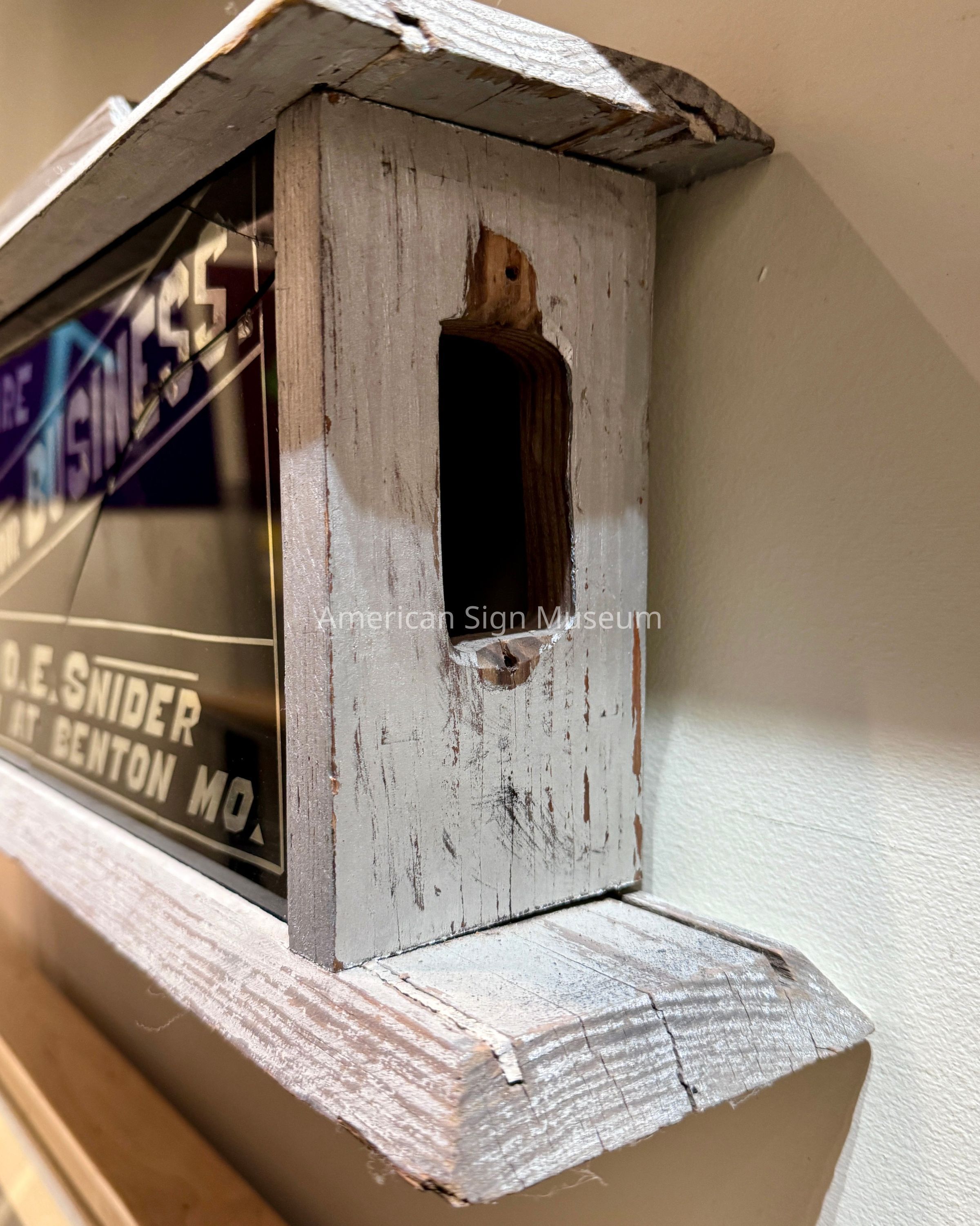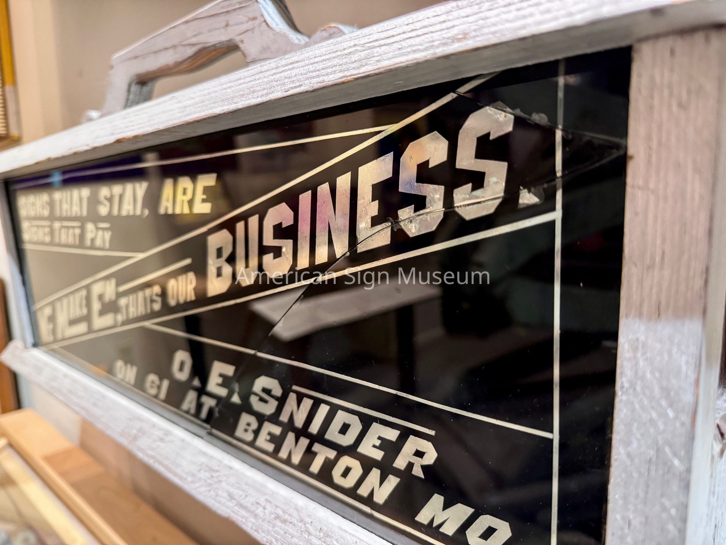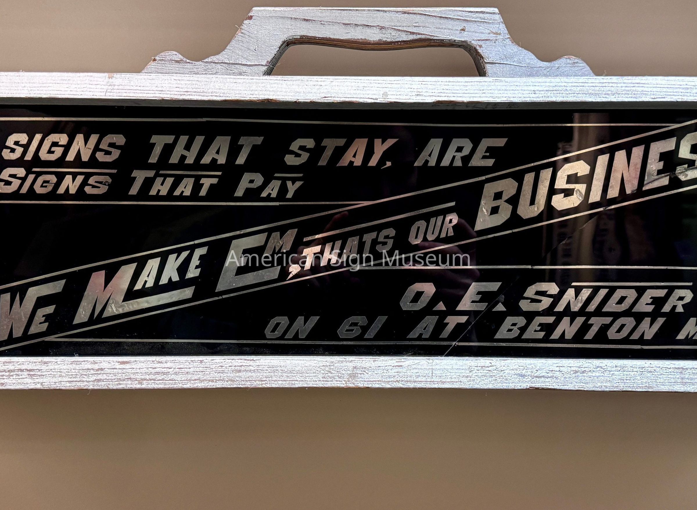 The wooden case with a reverse glass panel that is lettered with gold leafing is from the 1940s era. It was likely a portable, self-promotional sign/item that the sign-maker, O.E. Snider would have carried to jobs. The gilded glass surface is framed with a simple wood case, including a handle, that was painted white. The lettering states, "Signs that Stay are Signs that Pay", "We Make Em, That's out Business," and "O.E. Snider on 61 at Benton Mo."