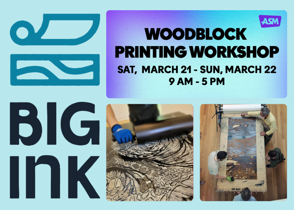 Registration for the workshop is closed, but the public is welcome to stop by and learn about printmaking throughout the day from 10 am – 4 pm. Visiting with the BIG INK artists is free with regular Museum admission.