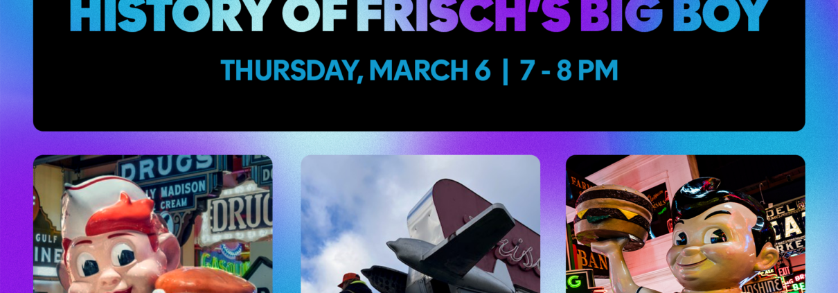The end of 2024 saw one of Cincinnati’s iconic signs come to the ASM – the Frisch’s Mainliner sign. Join the ASM for a look at how Frisch’s became a local favorite and the signs that helped get them there. Learn about the future of the Mainliner sign and efforts to restore it.