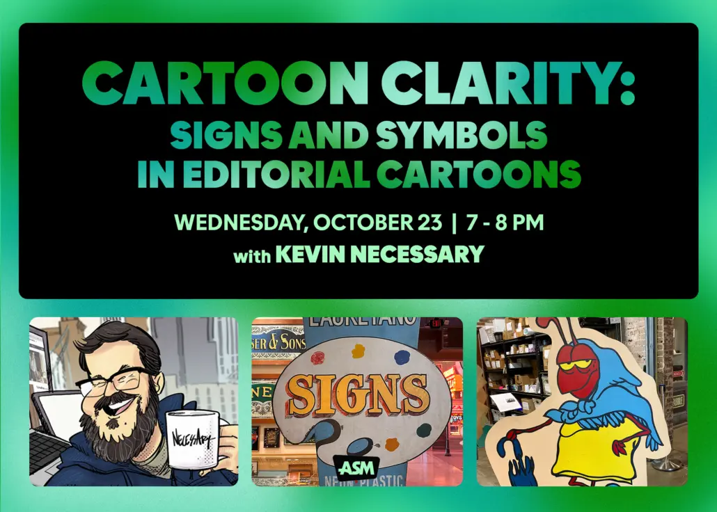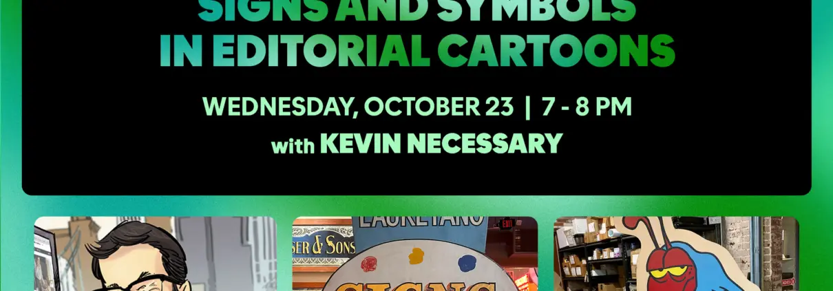 For centuries, editorial cartoonists have used signs and symbols in their work as visual shorthand to clearly and efficiently express their opinions to audiences. Editorial cartoonist Kevin Necessary explores the use of symbols in his own and others’ editorial cartoons and explains why this once thriving artform should still matter in today’s media landscape.