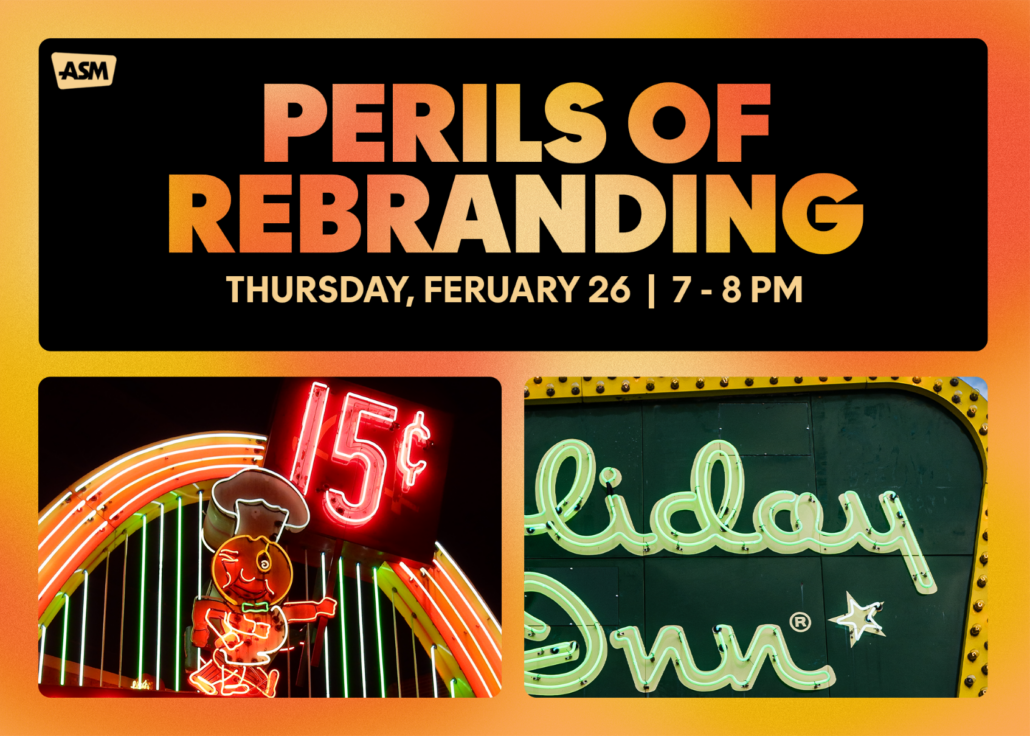 A rebrand is often meant to be a matter of design and keeping things fresh. But sometimes rebranding can have disastrous results for a company. Join the ASM’s director of education and engagement, Erin Holland, for a talk that will explore some of the dangers of rebranding and look at companies that managed to avoid or survive those perils and those that did not.